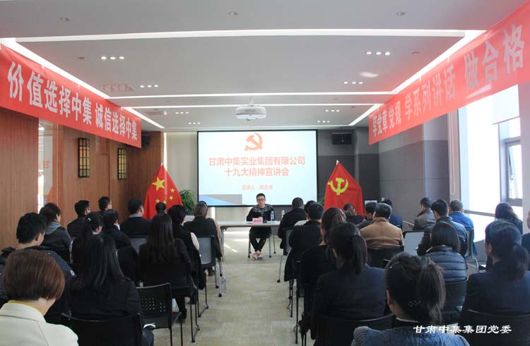 11月23日下午,甘肅中集實業集團有限公司黨委在公司黨建活動室開展黨的十九大精神專題教育活動,公司黨委書記、董事長周啟濤代表集團公司黨委,以《深入學習黨的十九大精神,建設美好幸福新蘭州》為主題,向公司全體黨員、入黨積極分子、集團公司各版塊及各部門負責人宣講黨的十九大精神。