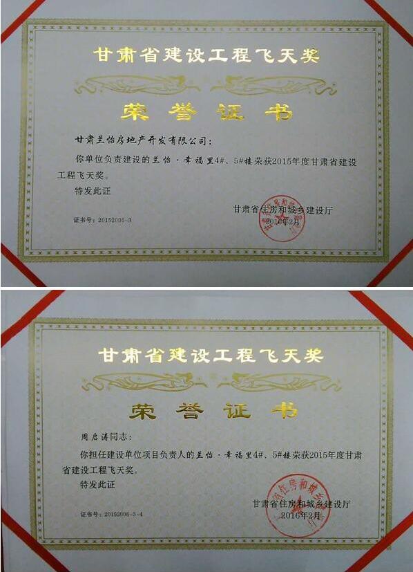 2016年2月5日,由甘肅省住房和城鄉建設廳評選的2015年度甘肅省建設工程“飛天獎”對社會各界發布,本次共發布41個“飛天獎”項目。其中,由甘肅中集實業集團子公司甘肅蘭怡房地產開發有限公司開發建設的中集·幸福里憑借高品質的開發標準,喜獲甘肅省2015年度建設工程“飛天獎”榮譽稱號,成為蘭州市安寧區唯一獲此殊榮的項目。