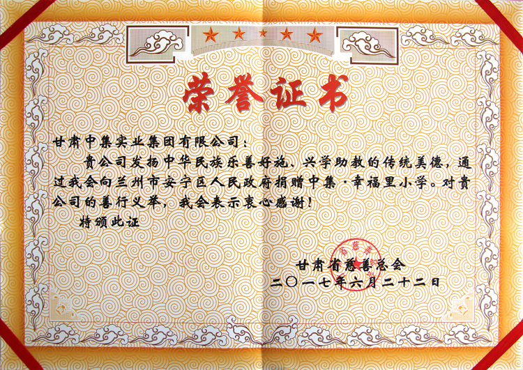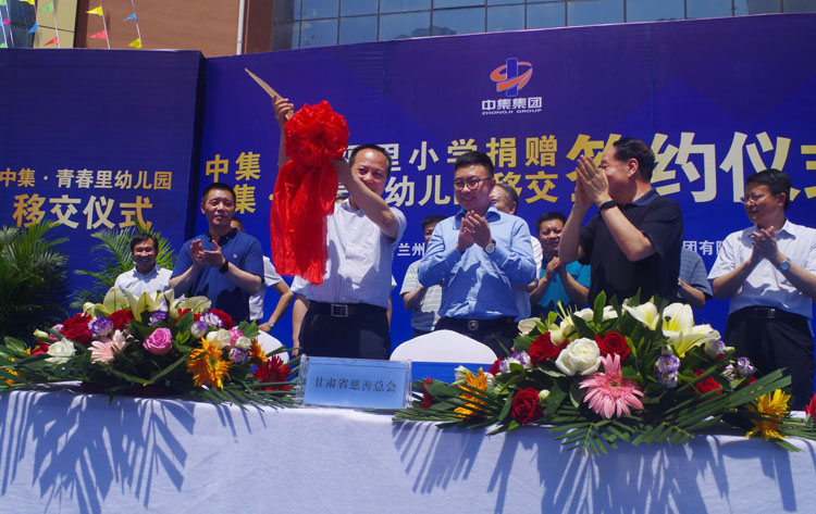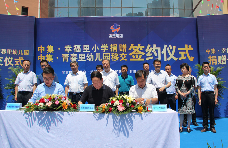 2017年6月22日下午14時,甘肅中集實業集團有限公司通過甘肅省慈善總會,向蘭州市安寧區人民政府捐贈價值1.02億元中集•幸福里小學暨中集•青春里配建幼兒園移交儀式在中集•幸福里小學操場隆重舉行。甘肅省原人大常委會副主任、甘肅省慈善總會會長朱志良,甘肅省原民政廳黨組書記、廳長、甘肅省慈善總會常務副會長梁國安,甘肅省教育廳副廳長趙 凱,蘭州市人大常委會副主任孫曉鋼,蘭州市人民政府副秘書長淡漢榮,安寧區區委書記王 方及安寧區區委副書記、區長雒澤民攜安寧區委、區人大、區政府、區政協四大班子領導,蘭州市教育局、蘭州市國土局、蘭州市規劃局、蘭州市房產局相關領導出席捐贈儀式,甘肅中集實業集團有限公司黨委書記、董事長周啟濤代表公司完成與安寧區人民政府捐贈及移交簽約。