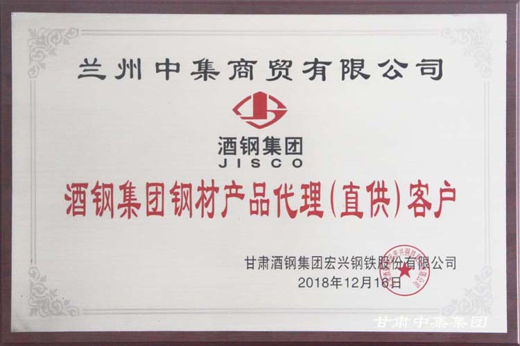 熱烈祝賀甘肅中集實業集團有限公司榮獲酒鋼集團“2018年度金牌代理商”殊榮
