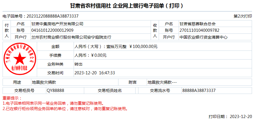 一方有難,八方支援,獲知積石山縣受災(zāi)情況,甘肅中集集團(tuán)第一時(shí)間緊急響應(yīng)、迅速?zèng)Q策,通過甘肅省慈善聯(lián)合總會(huì)為積石山地震災(zāi)區(qū)捐款10萬元,用于積石山縣災(zāi)區(qū)緊急救援和受災(zāi)困難群眾生活保障。